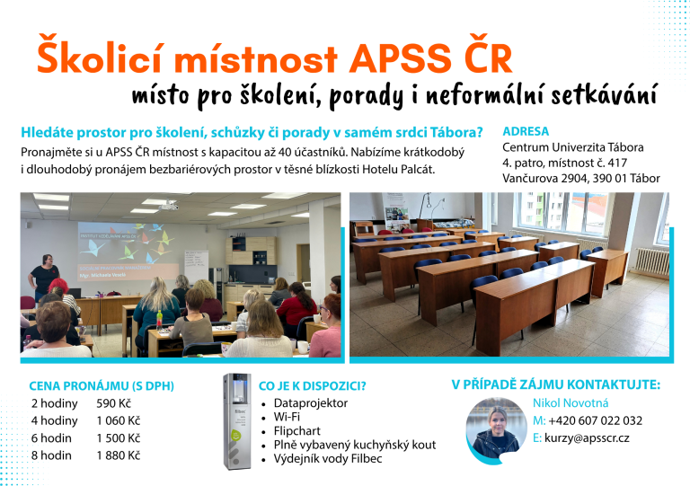 Samozřejmostí je vybavení místnosti dataprojektorem, k dispozici je připojení k internetu, kuchyňský kout či flipchart a výdejník vody Filbec. Kontaktujte Nikol Novotnou (mobil: +420 607 022 032, e-mail: kurzy@apsscr.cz), která vám ráda sdělí další informace.